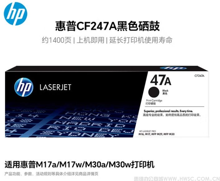 商品名称:惠普47A打印硒鼓(CF247A)黑色/鼓粉一体/1400页适合M17a/M17w/MFP 30a/30w