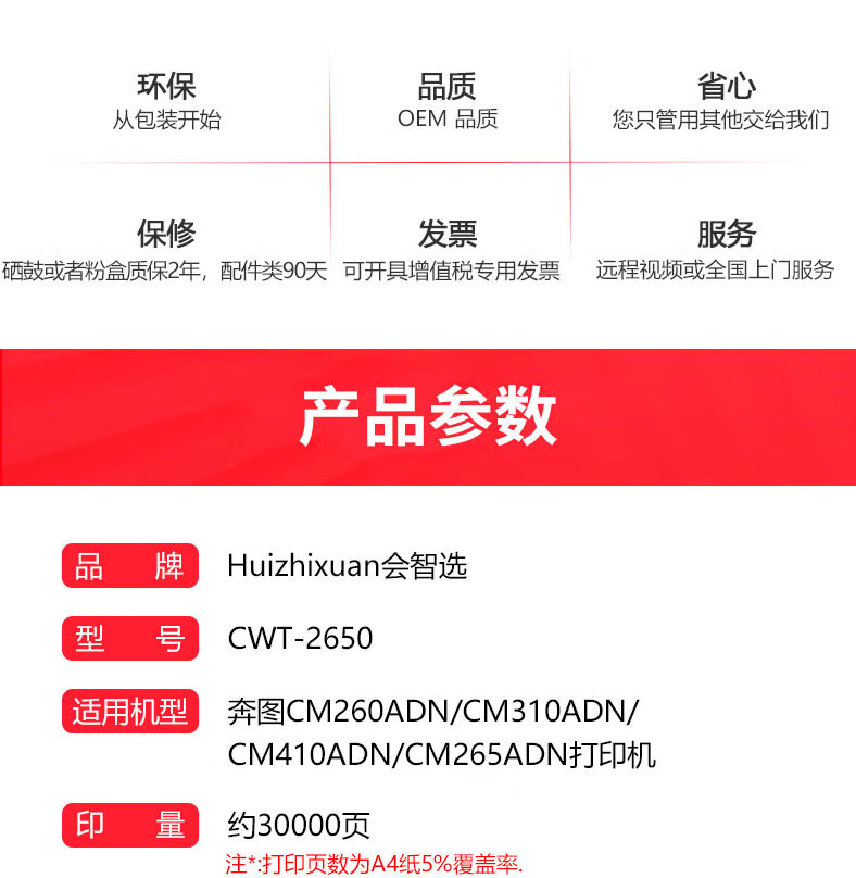 自营会智选废粉盒CWT-2600印量30000页 适合奔图CM265ADN/BM265ADN/BM315ADN/CM330ADN/CM260ADN/CM270ADN打印机