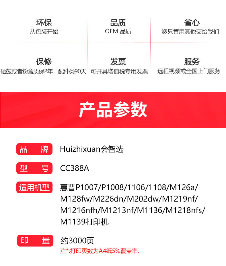 商品名称:会智选88A打印硒鼓(CC388A)黑色/鼓粉一体/1500页 适合惠普P1007/P1008/1106/1108/M126a/M128fw/M226dn等打印机